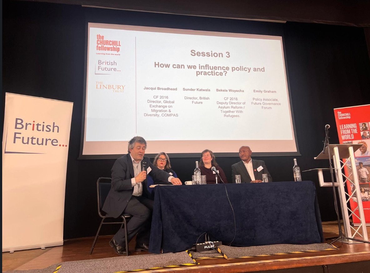 A huge thank you to all our speakers for sharing their insight and learning so generously. The keynote was delivered by Sunder Katwala (British Future), with a response from Churchill Fellow Rosie Carter, and the session was facilitated by Heather Rolfe (British Future).